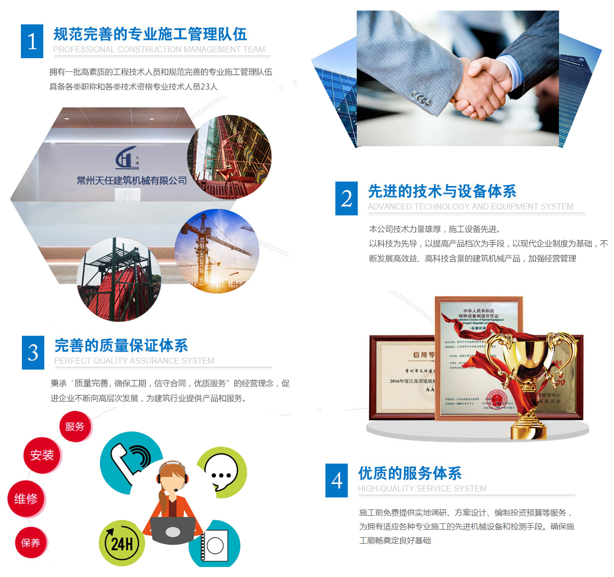 公司主要從事施工升降機、普通塔式起重機的制造、租賃、安裝、改造與維修等一條龍服務;擁有施工升降機(SCD200/200、SC200/200),QTZ63型普通塔式起重機,物料提升機(GJT10A)三大系列產品,并有中華人民共和國特種設備檢驗檢疫總局頒發的制造、改造與維修生產許可證。